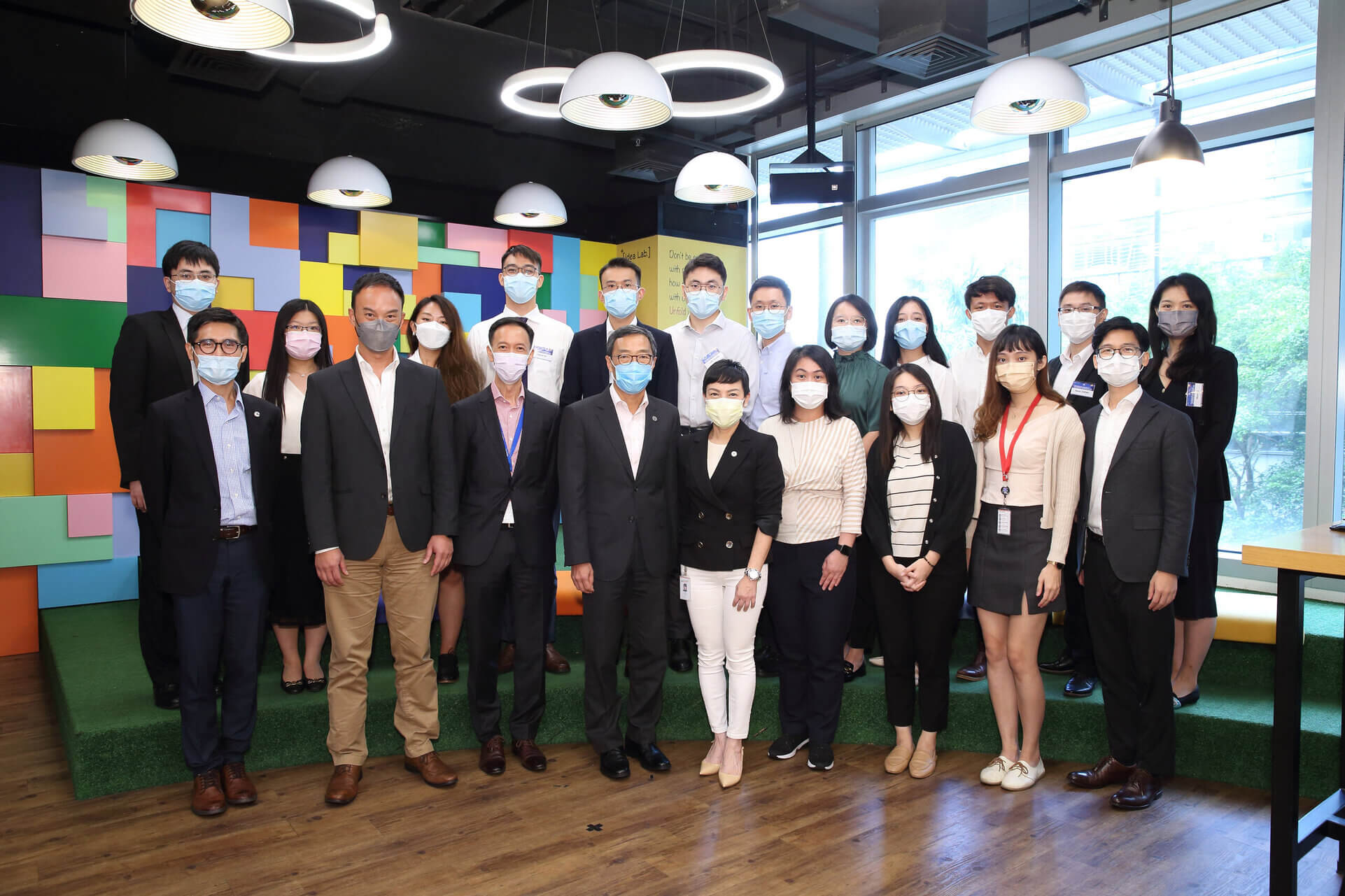 图一:香港科技园公司管理团队於2021年「明日创科领袖培训计划」的迎新日一同庆祝12位年轻人才的加入,前排: