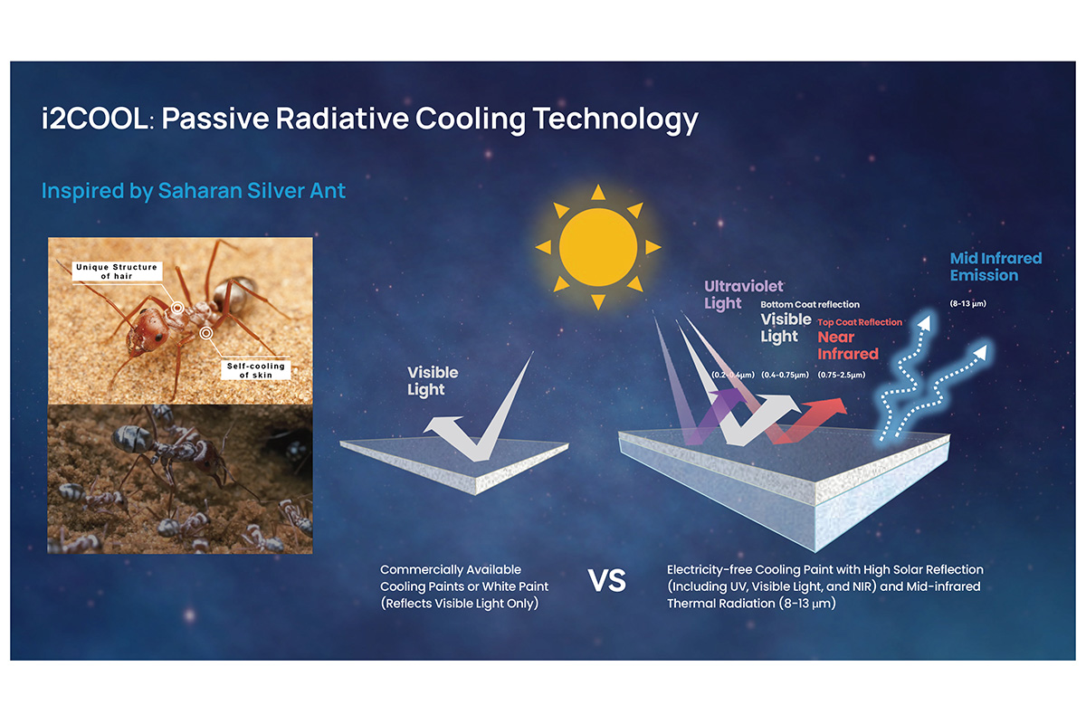 受到撒拉哈银蚁独特的毛髮结构启发,创冷团队经过7年持续的研究与开发,成功将实验室内的前沿技术转化为商业应用。以无电製冷塗层iPaint为例,该产品的製冷性能主要通过高分子聚合物与无机颗粒的结合实现,逹到了低成本和最优化的光学性能与热学效果。iPaint塗层拥有高达95%的太阳光反射率和95%的中红外辐射率,这一性能指标在业界领先,突破了传统隔热塗层难以达到90%以上反射率的技术瓶颈。
