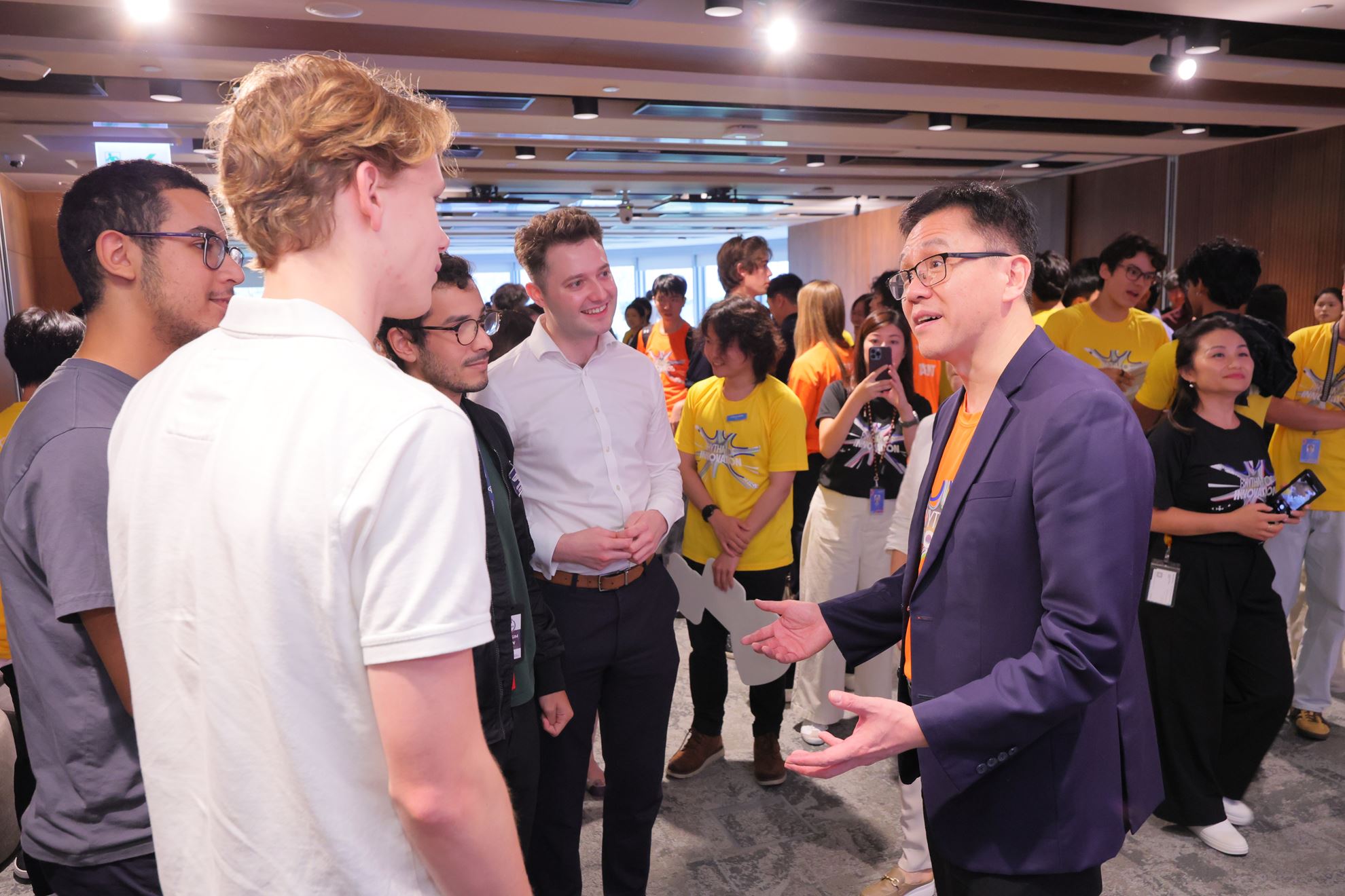 圖二及三:創新科技及工業局局長孫東教授與多名海內外實習生見面會談,就香港創科發展交流看法。讓全球精英親身了解香港創科的優勢與機遇,並通過實戰體驗本地蓬勃的創科生態,是吸引年輕人才投身創科的關鍵。
